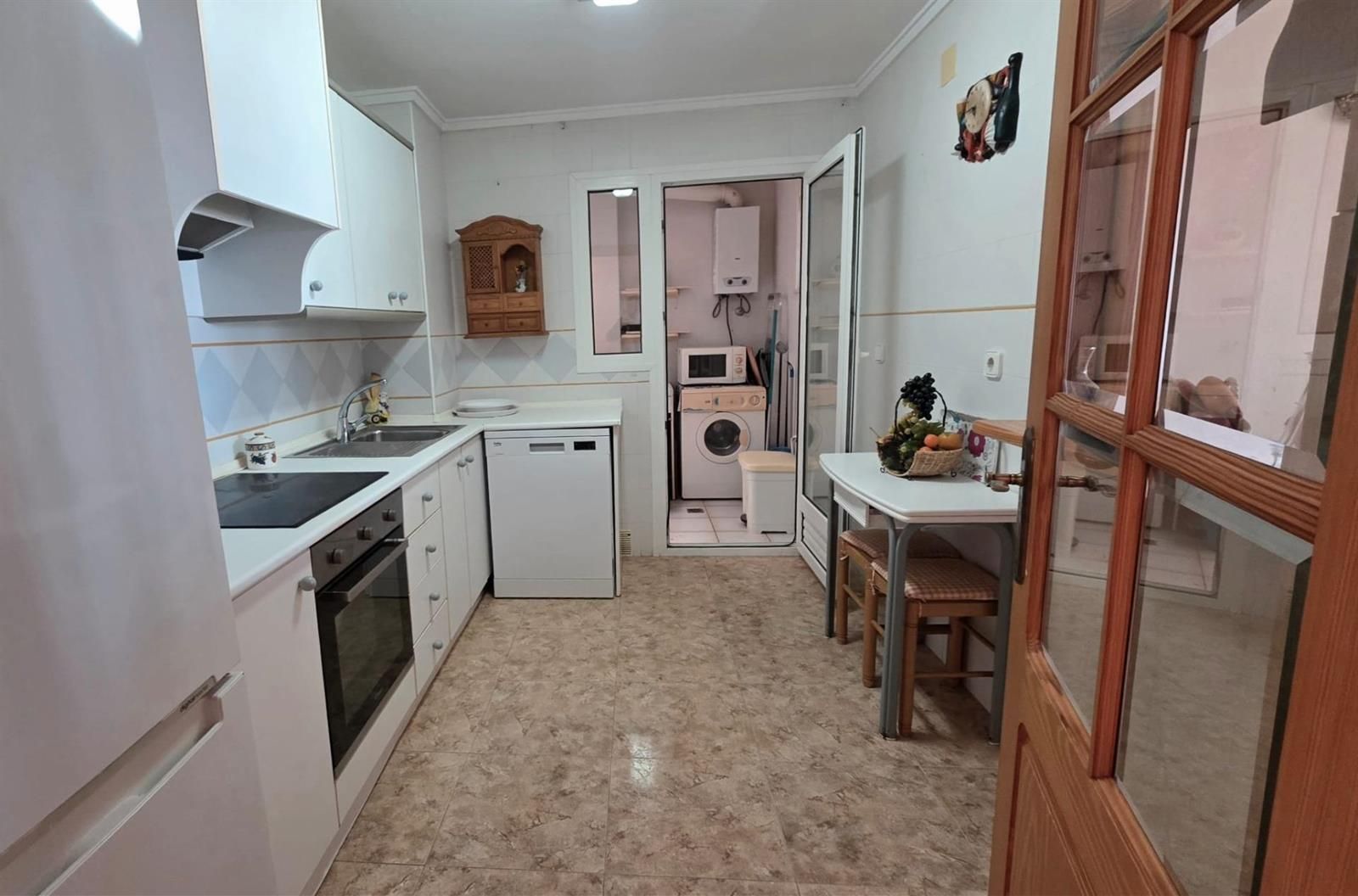 La cocina independiente te espera con los brazos abiertos... o quizás sería más correcto decir: ¿con las ventanas abiertas? Porque no solo cocinas ahí, también podrás hacer magia culinaria mientras miras hacia afuera e imaginas tus próximas aventuras gastronómicas bajo el sol mediterráneo. Y si necesitas descansar después de tanto cocinar (o simplemente comer), dirígete al espacioso salón-comedor que se abre directamente a esa terraza frente al mar – sí amigos míos, ¡frente AL MAR! Perfecta para esas cenas románticas o esos días perezosos tomando algo fresquito.