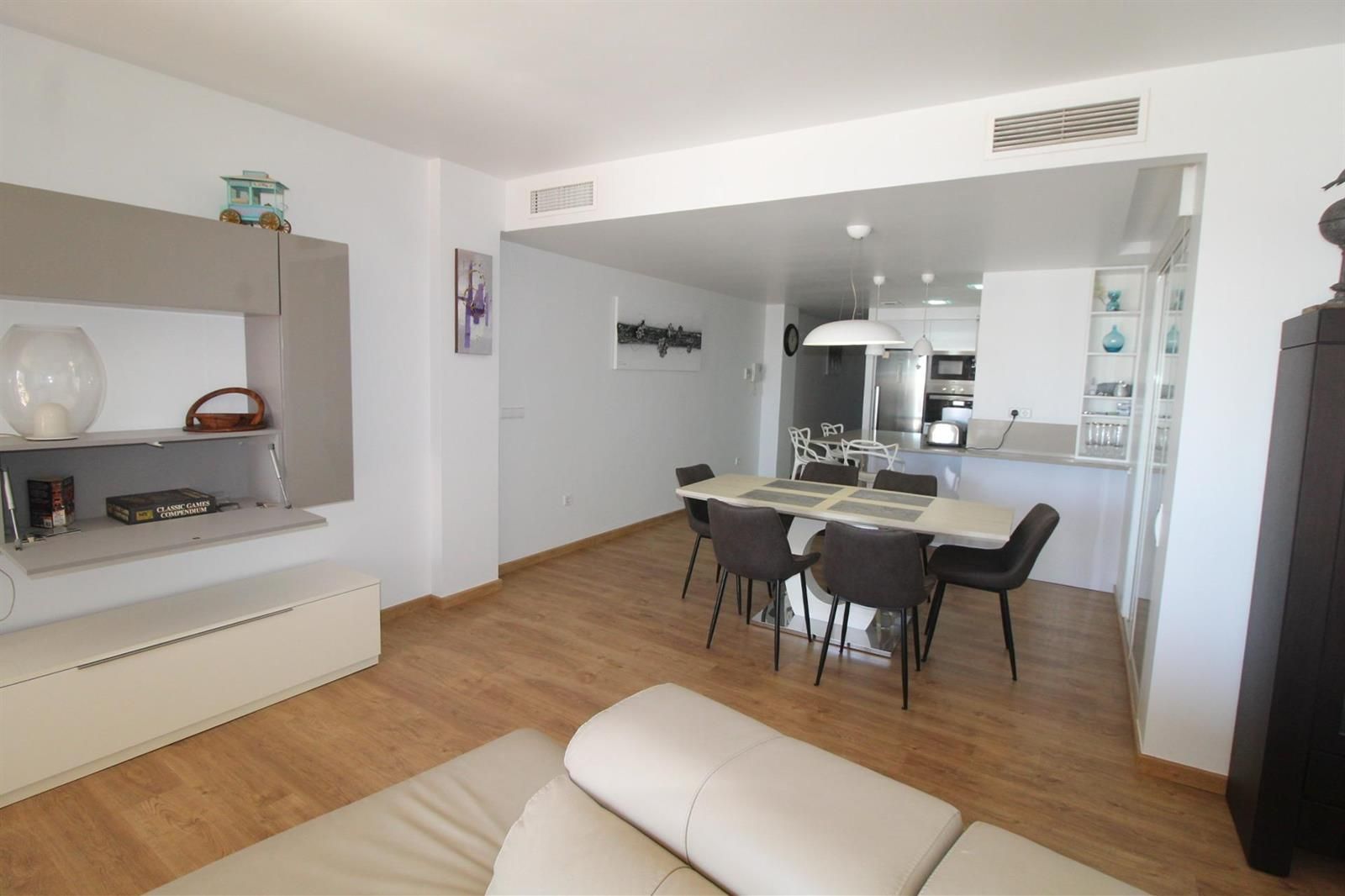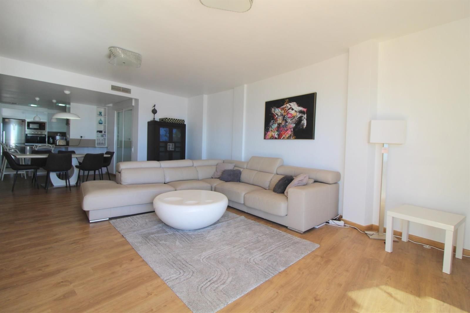 Zona Sur - El Escenario del Mar (112 m²): Un espacio diáfano diseñado para la contemplación. El salón señorial se funde con el horizonte mediterráneo a través de sus grandes ventanales. La cocina de diseño está totalmente equipada con electrodomésticos de alta gama, incluyendo frigorífico y congelador de gran capacidad integrados. En esta zona se encuentra el dormitorio principal, un refugio de paz con vestidor privado y baño en suite.