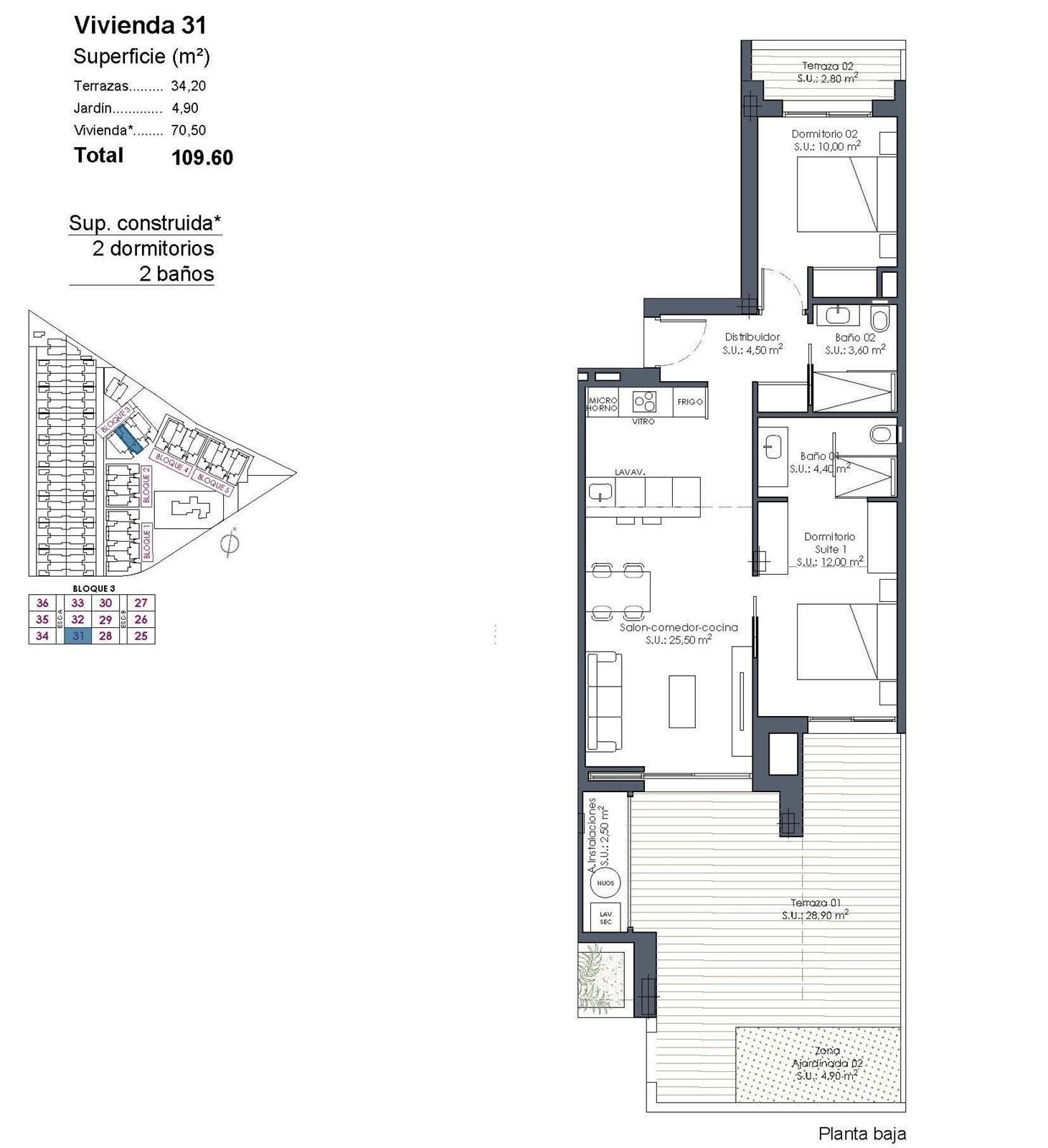 Apartamentos de nueva construcción en La Serena Golf-Los Alcázares, cerca de la playa Vida moderna frente al campo de golf en la Costa Cálida Descubra este exclusivo complejo residencial de nueva construcción situado en La Serena Golf, en Los Alcázares. Esta urbanización contemporánea cuenta con 66 elegantes apartamentos de 2 o 3 dormitorios y 2 baños, uno de ellos en suite, diseñados para ofrecer comodidad, elegancia y un excepcional estilo de vida mediterráneo a solo 300 metros del Mar Menor. Los Alcázares es una encantadora localidad costera conocida por su ambiente relajado, sus playas de arena y su largo paseo marítimo. Con más de 300 días de sol al año, la zona ofrece un entorno perfecto para la vida al aire libre, los deportes acuáticos y el golf. La localidad también cuenta con una amplia selección de restaurantes, tiendas, puertos deportivos e instalaciones deportivas, lo que la convierte en un destino muy deseable tanto para la residencia permanente como para las vacaciones. Apartamentos con terrazas, jardines y soláriums privados El complejo residencial ofrece varios tipos de propiedades que se adaptan a diferentes estilos de vida. Los compradores pueden elegir entre apartamentos en planta baja con jardines privados, viviendas en plantas intermedias con amplias terrazas o áticos con terrazas y grandes soláriums en la azotea. Los soláriums incluyen una ducha exterior y ofrecen la opción de añadir una cocina de verano y un jacuzzi privado, creando un espacio ideal para relajarse y divertirse mientras se disfruta de las vistas abiertas al campo de golf y al paisaje circundante. Cada vivienda ha sido diseñada con interiores luminosos y espacios diáfanos que conectan a la perfección con las zonas exteriores. Servicios estilo resort y zonas comunes excepcionales Una de las características más distintivas de esta promoción es su concepto de estilo resort. Los residentes pueden disfrutar de una espectacular piscina estilo laguna de aproximadamente 190 m2 con acceso estilo playa y zonas de relax con camas balinesas. Las instalaciones comunes adicionales incluyen jardines paisajísticos, una zona de spa, gimnasio y sauna situados en el sótano. El complejo también ofrece un parque infantil, dos pistas de petanca y aseos comunes cerca de la zona de la piscina, creando un ambiente acogedor para los residentes y los invitados. Acabados de calidad y características modernas Los apartamentos están construidos con materiales modernos y especificaciones de alta calidad diseñadas para ofrecer comodidad y estilo. Cocina totalmente equipada con electrodomésticos de acabado en cristal blanco Baños con tocadores, mamparas de ducha y espejos retroiluminados Persianas motorizadas Paquete de iluminación básico Aire acondicionado por conductos totalmente instalado Plaza de aparcamiento subterráneo para cada propiedad Aparcamiento subterráneo para bicicletas y trasteros opcionales Ubicación privilegiada cerca de la playa y el golf Playa del Mar Menor a 0,3 km Golf La Serena junto a la urbanización Centro de Los Alcázares a 2 km Cartagena a 22 km Murcia a 40 km Aeropuerto Internacional de la Región de Murcia a 30 km Aeropuerto de Alicante-Elche a 90 km Las tranquilas y poco profundas aguas del Mar Menor son ideales para nadar, navegar y practicar paddle surf durante todo el año. Asegure su vivienda en La Serena Golf Resort Estos modernos apartamentos combinan la vida junto a la playa, vistas al campo de golf desde la mayoría de las unidades y comodidades estilo resort en una de las zonas más atractivas de la Costa Cálida. Póngase en contacto con nosotros hoy mismo para recibir más información o concertar una visita y asegurar su nueva vivienda en La Serena Golf-Los Alcázares.